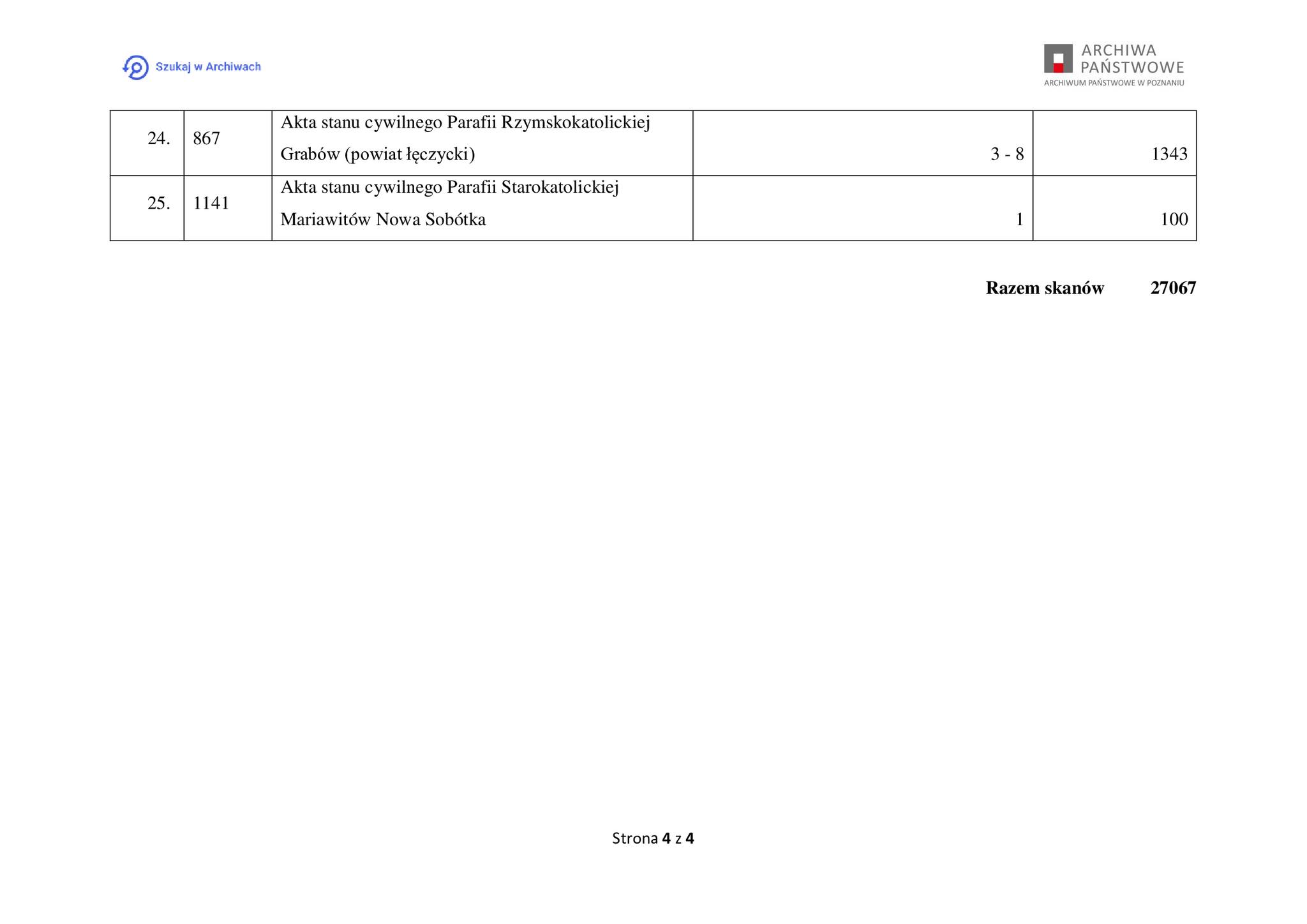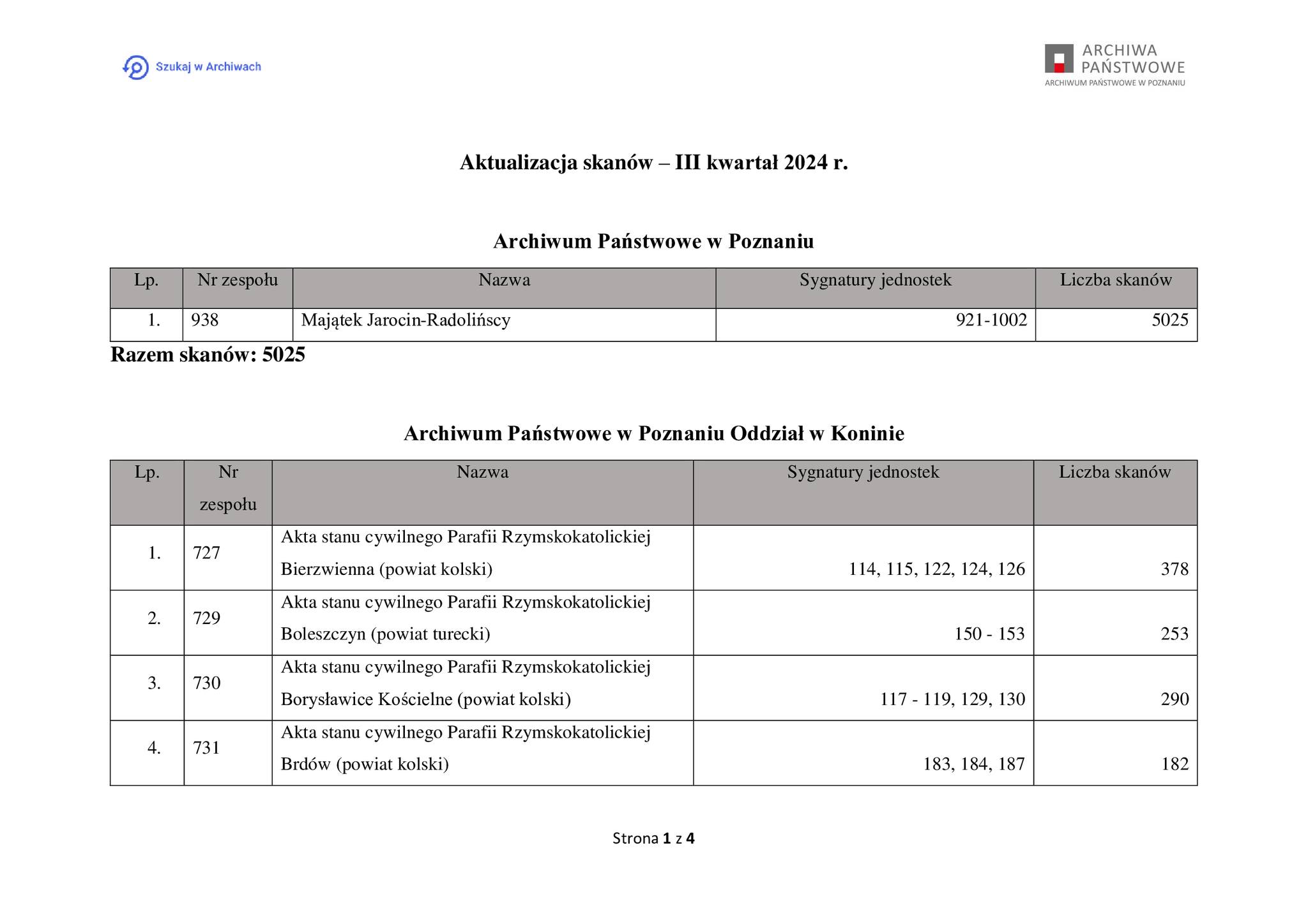 W III kwartale 2025 roku Archiwum Państwowe w Poznaniu opublikowało na portalu Szukaj w Archiwach ponad 27 tysięcy skanów z 26 zespołów archiwalnych. Większość skanowanego zasobu stanowiły akta metrykalne urzędów stanu cywilnego przechowywane w Oddziale w Koninie, a także jednostki pochodzące z zespołu „Majątek Jarocin – Radolińscy”.
