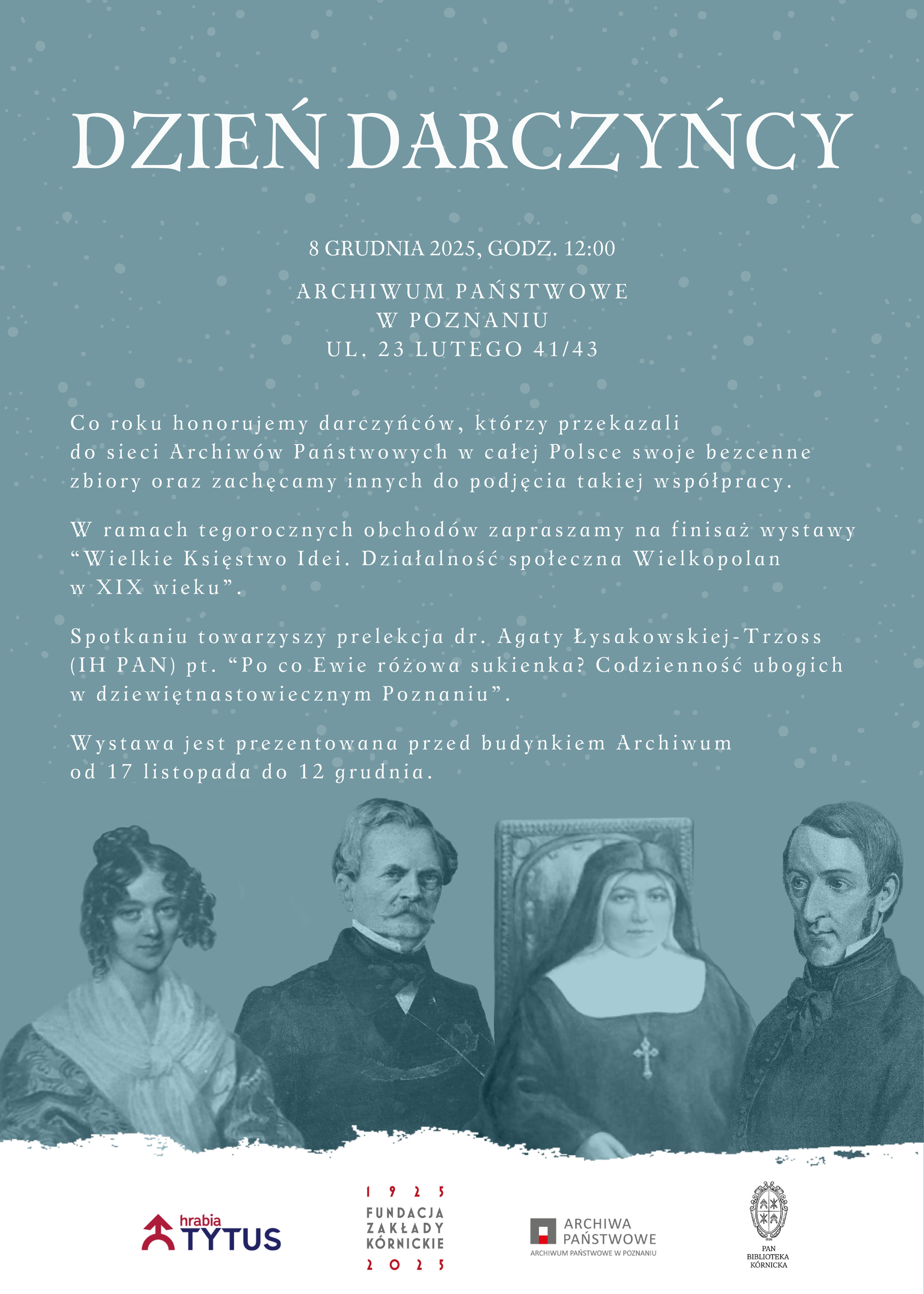 Tegoroczne wydarzenie zostanie wzbogacone o finisaż wystawy „Wielkie Księstwo Idei. Działalność społeczna Wielkopolan w XIX wieku”, przygotowanej we współpracy Archiwum Państwowego w Poznaniu, portalu Hrabia Tytus oraz Biblioteki Kórnickiej Polskiej Akademii Nauk. Ekspozycja prezentowana jest przed budynkiem Archiwum od 17 listopada do 12 grudnia 2025 roku i przybliża różnorodne przejawy aktywności społecznej mieszkańców Wielkopolski w XIX stuleciu.